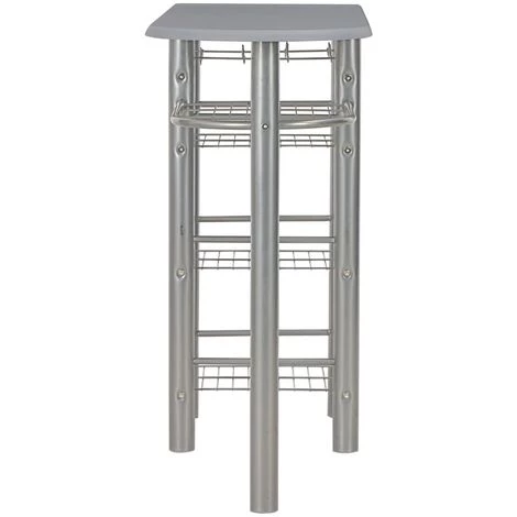 Fabriqué en bois et en acier durable, cet ensemble de bar en 3 pièces se distingue par sa polyvalence et constituera un supplément distinctif aux maisons, aux jardins, aux bars, aux pubs ou aux restaurants. Fabriqué en bois durable, les surfaces sont faciles à nettoyer. Les cadres en acier offrent une grande stabilité. Les chaises peuvent être repliées lorsqu’elles ne sont pas utilisées, afin de gagner de la place. De plus, plusieurs tablettes de rangement et un porte-bouteilles de vin se trouvent sous la table pour que vos affaires soient bien organisées et à portée de main. L’ensemble de salle à manger est facile à assembler. La livraison inclut 1 table avec étagères et 2 chaises pliantes.