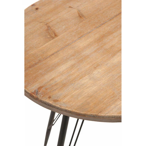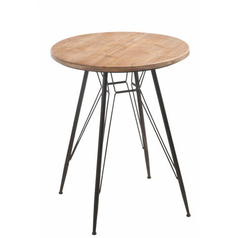 La table ronde industrielle est composée de quatre pieds en métal noir et d’un plateau en bois.