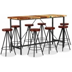 Cet ensemble de bar cool a un style industriel et sera un supplément distinctif à n’importe quelle maison, bar ou restaurant. La table de bar est faite de bois de récupération massif, ce qui signifie qu’elle a les caractéristiques de différents bois comme le teck, le bois de manguier, l’acacia, etc. Le bois de récupération est solide, stable, durable et beau. Des signes d’usure et d’artisanat donnent à chaque pièce un style unique. Il est entièrement fait à la main. Les pieds en acier robuste rendent la table de bar très robuste et durable et s’ajoutent à son style industriel spectaculaire. Remarque importante : Les grains et les couleurs du bois peuvent varier d’une pièce à l’autre, ce qui rend chaque pièce unique ; la livraison est aléatoire. Les tabourets de bar sont recouverts de cuir véritable doux au toucher, ce qui rend les tabourets extrêmement durables et confortables. Les pieds en acier font les tabourets très robustes et ajoutent à leur style industriel spectaculaire.