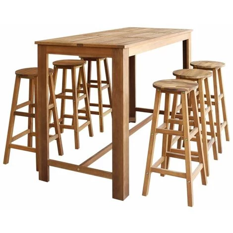 Cet ensemble de table et de tabourets a un design simple mais intemporel. Notre ensemble de bar conviendra à une grande variété de localisations, tels que des maisons, des bars et des cafés, grâce à son design rustique. Fabriqués en bois dur d’acacia massif avec une finition à l’huile, la table et les tabourets sont robustes et résistants aux intempéries. La structure en bois les rend très durables, et les repose-pieds vous permettront de vous asseoir confortablement sur les tabourets. La livraison comprend 1 table et 6 tabourets.