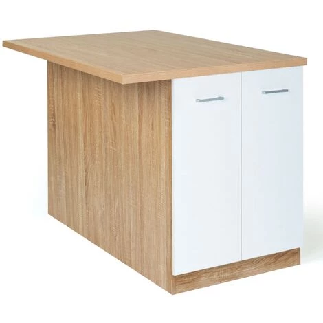 Descriptif de l’îlot central bois façon hêtre et portes blanchesL’espace de votre intérieur, de votre cuisine sera optimisé grâce à notre îlot central avec plan de travail et rangements incorporés en bois façon hêtre et portes blanches !Le design moderne de cet îlot central, ses lignes droites et épurées, ses couleurs sobres tout en contraste, et ses finitions mates lui permettent de s’adapter idéalement à tout type d’intérieur ! Il conférera un aspect net et rangé à votre cuisine !Son format généreux mais néanmoins compact, peu encombrant, facilite la circulation tout en évitant les pas inutiles au quotidien dans votre pièce de vie. Il structure l’espace de votre cuisine ! Parfait pour les pièces de vie ouvertes et aérées!Cet îlot central de forme rectangulaire classique est idéalement conçu pour recevoir 2 couverts. Ambiance cosy pour des petits-déjeuners à 2 !Son plateau d’une épaisseur de 3 cm offre un solide plan de travail large et profond pour poser plats, bouteilles, etc. Ce plan de travail débordant sur un côté a pour avantage de servir de mange-debout et de pouvoir ainsi manger sur le pouce debout ou sur un tabouret de bar !Pratique et fonctionnel, il constitue une véritable solution de rangement rapide pour l’aménagement des petits espaces car il dispose de 2 portes latérales à chaque extrémité aux jolies poignées argentées façon chrome, donnant sur 2 compartiments dotés d’une étagère intermédiaire pour organiser votre rangement ! Discrets, cachés sous le plan de travail, ils représentent un véritable gain de place !Vous bénéficiez ainsi de nombreux espaces de rangement pour vos ustensiles, couverts, vaisselle, bouteilles et condiments ! De plus, vous les conservez à portée de main et vous optimisez l’espace !Sa structure en PB (panneaux de particules) épaisseur 1,5 cm lui apporte stabilité et robustesse.Tantôt coin repas, tantôt coin cuisine, avec sa triple fonction table haute/plan de travail/meuble de rangement, il vous fera gagner du temps et de l’espace, et apportera un look contemporain à votre intérieur !Optez sans tarder pour cette installation tendance et conviviale à la fois fonctionnelle et décorative !Dimensions de l’îlot central de cuisine IVODimensions totales : Longueur 120 cm x largeur 80 cm x Hauteur 82 cmNettoyage rapide et entretien facile avec chiffon humide doux.Découvrez l’ensemble de nos meubles et éléments de cuisine sur notre boutique en ligne. – HORS CORSE -article non livrable en Corse