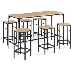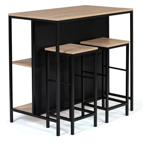 Descriptif de l’îlot DETROIT et 2 tabourets design industrielSi vous cherchez à aménager votre espace cuisine de manière optimisée, la table de bar DETROIT et ses 2 tabourets sont faits pour vous !Avec son design industriel bi-matière bois et métal, ses coloris naturels et ses lignes sobres et épurées, le mange-debout DETROIT se mariera avec tous les types d’intérieurs !Multifonction, ce meuble vous servira à la fois de plan de travail, de rangement et de table haute pour manger sur le pouce ou prendre un verre entre amis dans une ambiance décontractée !Son format compact est idéal pour aménager les petits espaces comme les studios ou venir délimiter l’espace de votre cuisine ouverte ! Les deux tabourets de bar se glissent sous le plateau pour un gain de place maximal !Hyper pratiques, ses 2 étagères vous permettront de ranger élégamment vaisselle, petit électroménager ou encore nourriture, optimisant ainsi votre rangement !Sa structure en panneaux de particules de bois (PB épaisseur 1,5 cm) et métal noir (2×2 cm) lui garantit solidité et stabilité.Un meuble compact et ultra fonctionnel spécialement conçu pour les petits espaces !Dimensions de la table de bar avec étagères et 2 tabouretsDimensions îlot : Longueur 100 cm x largeur 60 cm x Hauteur 95 cmDimensions étagères : Longueur 100 cm x largeur 30 cmHauteur entre chaque étagère : 40 cmDimensions des tabourets: Longueur 32 cm x largeur 32 cm x Hauteur 67 cmHauteur des pieds : 10 cmRetrouvez nos meubles et éléments de cuisine ainsi que l’ensemble de notre collection industrielle sur notre boutique en ligne ! – HORS CORSE -article non livrable en Corse