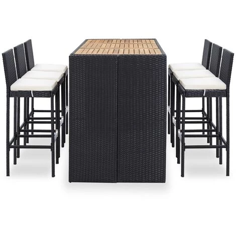 Notre mobilier de bar en résine tressée sera le point de mire de votre jardin, patio ou terrasse. Il a un design élégant. L’armature en acier revêtu de poudre rend l’ensemble solide et robuste et grâce à leurs constructions légères, tous les articles sont faciles à déplacer. Grâce au rotin synthétique résistant aux intempéries et à l’eau, l’ensemble de bar est facile à nettoyer. Le dessus de table est fait de bois d’acacia massif, un bois dur tropical, qui est également résistant aux intempéries et durable. Les coussins de siège, faits en polyester hydrofuge, sont épais, doux et très confortables grâce à leur rembourrage en mousse. Les housses amovibles et lavables sont équipées de fermetures éclair. Remarque : nous vous recommandons de couvrir l’ensemble pendant la pluie, la neige et le gel.