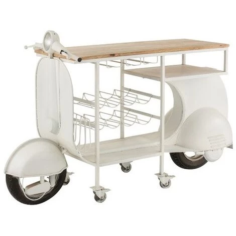 Ce joli bar en forme de scooter est parfait pour décorer votre coin bar avec une originalité inouïe. Il est fait en manguier massif sur le plateau avec un corps en métal blanc. Sa structure dispose également d’un espace de rangement pouvant accueillir 6 verres et 6 bouteilles.Les autres articles de la collection peuvent compléter ce bar pour créer une atmosphère harmonieuse.Matière : Métal et bois de manguier Couleur : BlancDimensions : L 180 x P 64 x H 102 cmPoids : 42 kgNombre de colis : 1Fabrication : Europe A monterGarantie : 2 ansNous ne livrons pas en Corse.
