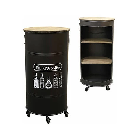Ce bar sur roulettes noires en bois et mĂ©tal assure une dĂ©coration simpliste et originale chez vous. Avec son design rĂ©vĂ©lant un tonneau rĂ©cupĂ©rĂ© et relookĂ©, ce modĂšle s’associe avec des tabourets de bar aux mĂȘmes caractĂ©ristiques. Vous pouvez dĂ©placer facilement ce bar depuis le salon vers la cuisine, en le coulissant sur ses roulettes. Son corps cylindrique est sectionnĂ© en trois compartiments, offrant une façade ouverte et un fond opaque. Le plateau supĂ©rieur ainsi que les tablettes internes affichent une couleur naturelle, issue de leur fabrication en bois. Pour la structure, le corps du bar est en mĂ©tal, dotĂ© d’une finition noire.