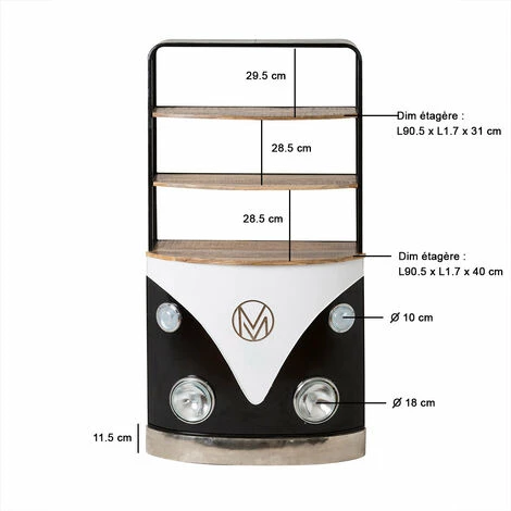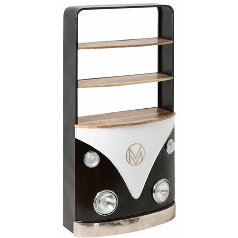Voyagez à travers le monde en adoptant ce bar avec étagères combi ! Véritable accessoire de décoration vintage. Son principal atout c’est sans aucun doute son originalité. Réalisé en métal, il est doté d’un plateau en bois de manguier qui apporte un très bel équilibre entre les nuances. Il est loin d’être banal grâce à son design et ses phares apparents. Les phares sont authentiques et leurs fixations sont ré-ajustées et vissées directement sur la façade du meuble.Chaque modèle est unique et présente ses propres imperfections et irrégularités. Ce meuble est livré monté.