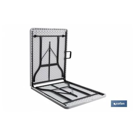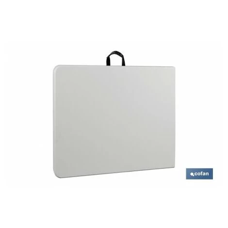Tavolo pieghevole rettangolare BLANCA in materiali resistenti e leggeri per eventi e celebrazioni. Questo robusto tavolo è facile da aprire e chiudere occupa poco spazio quando è piegato. Include maniglia. HDPE