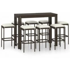 Cet ensemble Ă©lĂ©gant de bar de jardin vous permet de passer des moments agrĂ©ables et confortables avec votre famille et vos amis. La table de bar est soutenue par un cadre en acier enduit de poudre, ce qui la rend stable et robuste. Le dessus de table est idĂ©al pour placer des boissons, de la nourriture ou des objets dĂ©coratifs. Les tabourets ont une construction solide de cadre en acier et sont faits de rĂ©sine tressĂ©e rĂ©sistante aux intempĂ©ries, assurant la stabilitĂ© et sont faciles Ă dĂ©placer. Le coussin et le repose-pied ajoutent Ă©galement du confort d’assise supplĂ©mentaire au tabouret. La housse de coussin en polyester avec fermeture Ă©clair dissimulĂ©e la rend facile Ă nettoyer.