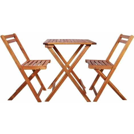Cet ensemble de bistro sera un supplément pratique et décoratif à votre jardin, balcon ou patio. Cet ensemble de mobilier de jardin est fait de bois d’acacia massif, résistant aux intempéries et très durable, qui a reçu une finition à l’huile pour donner une couleur chaude à l’ensemble. La table et les chaises peuvent être pliées pour faciliter le rangement et le transport. L’assemblage est facile. La livraison comprend 1 table pliable et 2 chaises pliables.