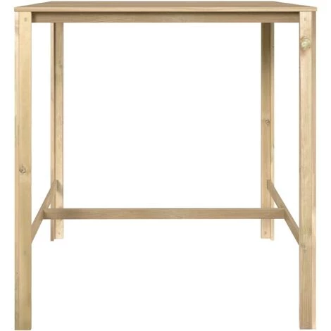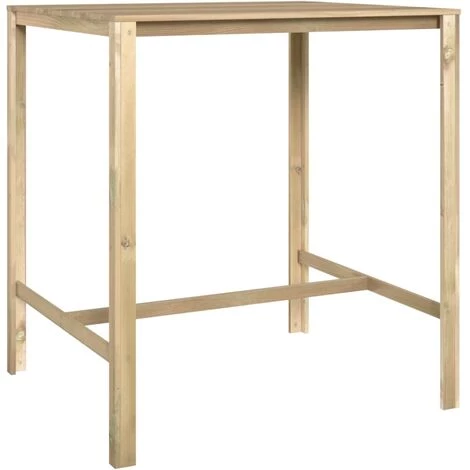 Cette table de bar en bois avec un aspect simple est conçue pour être un excellent supplément à vos espaces extérieurs. Vous pouvez discuter ou prendre un bon repas avec votre famille ou vos amis autour de cette belle table de patio. Elle est fabriquée en bois de pin imprégné, ce qui la rend durable et résistante à la corrosion. La table de salle à manger de jardin convient donc à un usage extérieur. Le design élégant de la table de bar en fait un accessoire intemporel pour votre jardin. De plus, elle peut également être utilisée à l’intérieur. Remarque : Afin de prolonger la durée de vie de vos meubles d’extérieur, nous vous recommandons de les nettoyer régulièrement et de ne pas les laisser à l’extérieur sans protection inutilement.Nettoyage : Utiliser une solution savonneuse douce.Stockage : Si possible, stockez dans un endroit frais et sec à l’intérieur. Si le produit est stocké à l’extérieur, protégez-le avec une housse imperméable. Essuyez et séchez l’excès d’eau ou de neige des surfaces planes après la pluie ou une chute de neige. Permettez une circulation d’air suffisante afin d’éviter les dommages liés à l’humidité.